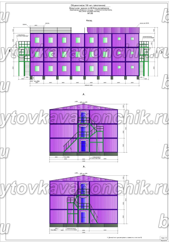 ГлавнаяПроекты готовых решенийМодульные здания → Фасады трехэтажного общежития на 150 человек из 48 шт БК